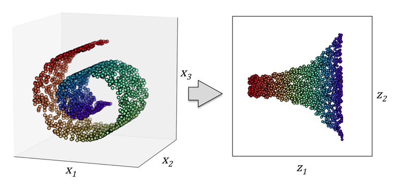 Compress a 3D Swiss Roll onto a new 2D feature subspace